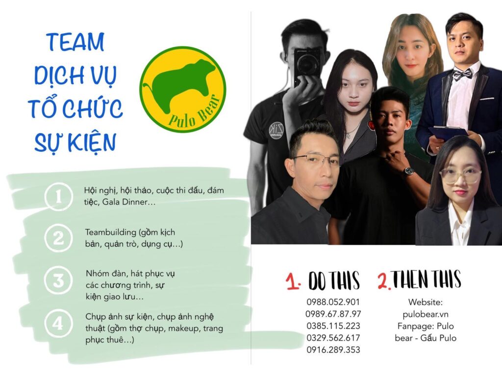 Với lực lượng có kinh nghiệm MC cùng dàn âm thanh, ánh sáng chất lượng phục vụ các chương trình Gala Dinner, hội nghị, đám tiệc và các chương trình giao lưu văn hóa - văn nghệ trên địa bàn huyện từ năm 2011 đến nay; các thành viên được trui rèn và trưởng thành từ môi trường làm sự kiện nhà nước và khu du lịch trong nước; do đó Team Pulo Bear nhận hỗ trợ tổ chức các chương trình sự kiện nêu trên với tiêu chí đảm bảo quyền lợi, mục đích của khách hàng và phù hợp với năng lực của Team.